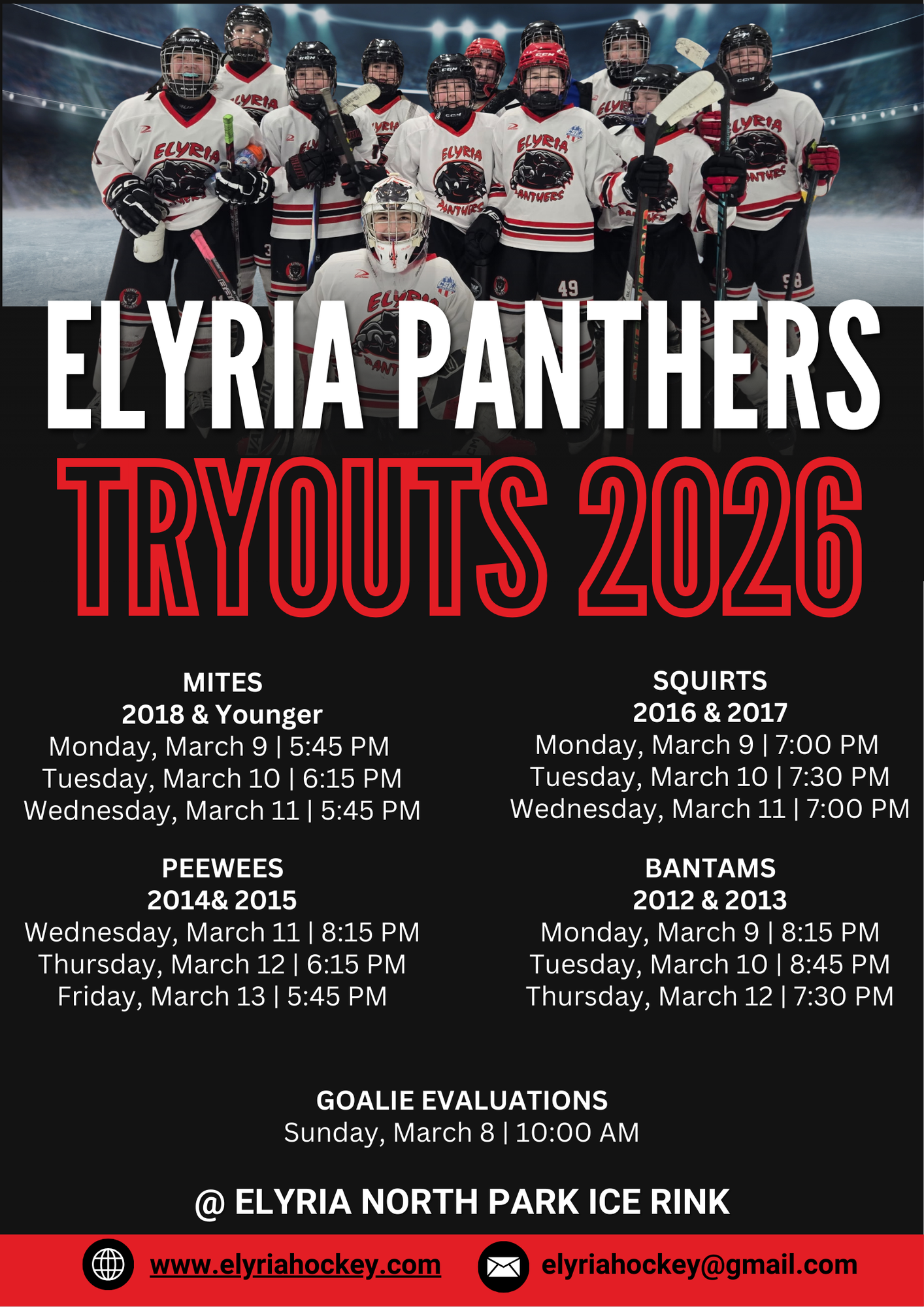Get ready for some springtime hockey! The Elyria Panthers are excited to announce our participation in the 2026 North Olmsted 8U Mite Spring League, running from April 8th to May 6th. We plan to have teams in the Red, White, and Blue divisions. All games will be played at the North Olmsted Rec Center, with each team playing an 8-game schedule. Go Panthers!